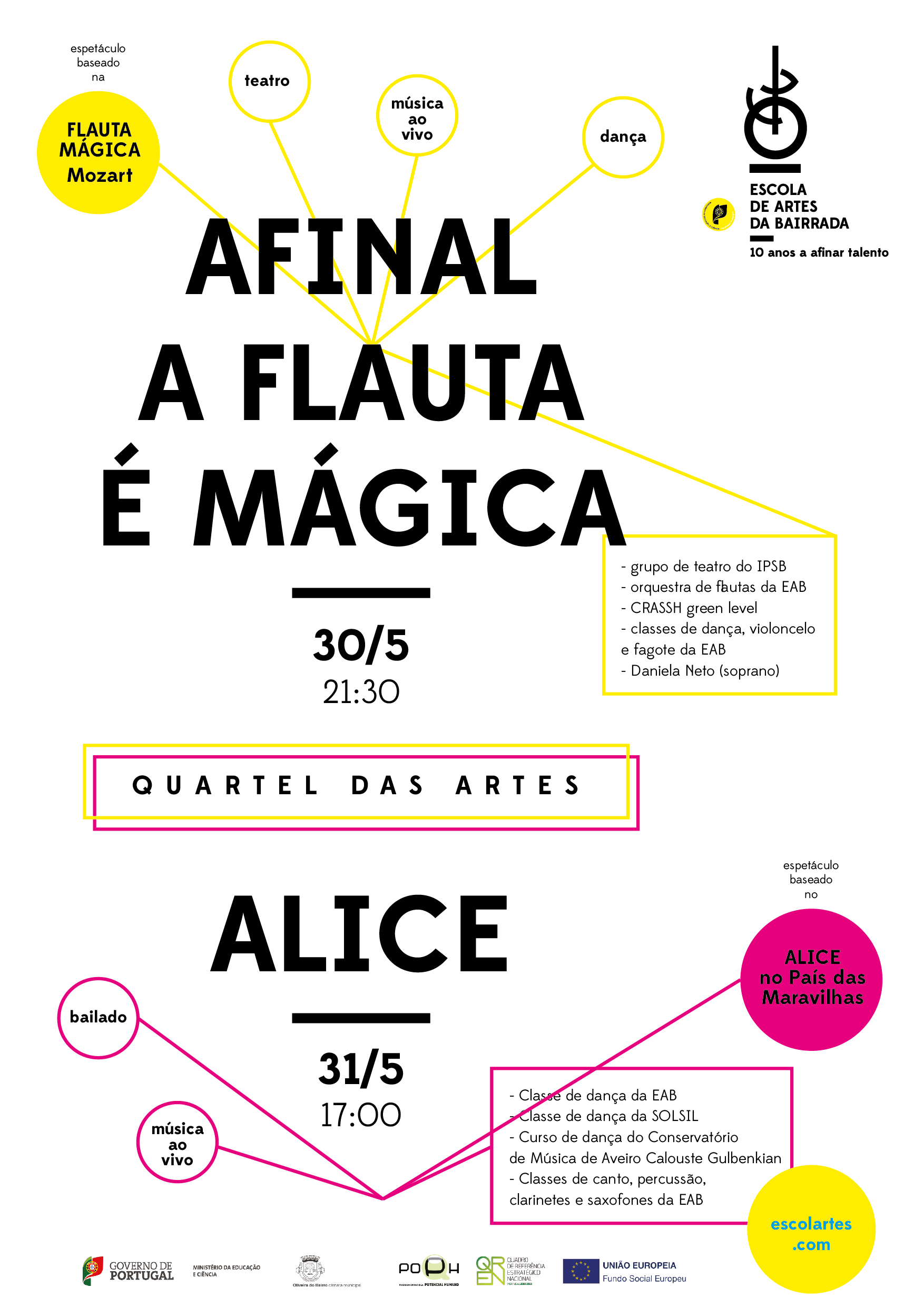 A Escola de Artes da Bairrada apresentará este ano dois grandes espetáculos de teatro musical para sala fechada, ambos no Quartel das Artes Dr. Alípio Sol em Oliveira do Bairro, contando com jovens atores, bailarinos, cantores e instrumentistas. São espetáculos de grande fôlego que conjugam teatro, dança, música e cenografia.
